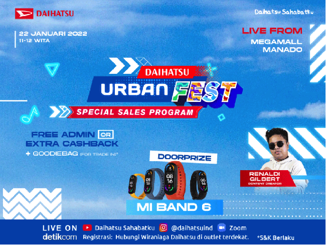 Di Daihatsu Urban Fest 2022, kamu bisa mendapatkan hiburan sekaligus memiliki mobil baru dengan penawaran spesial dari Daihatsu yang pastinya menambah kebahagiaan di awal tahun 2022. Jangan lewatkan pagelaran istimewa ini dengan langsung datang ke Mega Mall Manado atau menyaksikan live streaming di detikcom, atau kanal YouTube Daihatsu Sahabatku, Instagram @daihatsuind, atau Facebook @DaihatsuIndonesia.