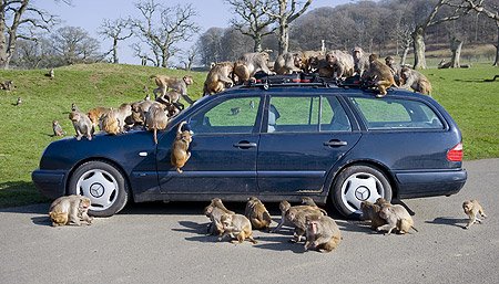 Gerombolan monyet di taman safari Longleat ini sendiri sukses mempreteli mobil milik taman safari. Mercedes-Benz benar-benar dibuat tidak berdaya.