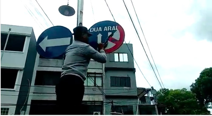 Terlihat dalam video, rambu asli ditutup menggunakan scotlite bergambar jalur dengan tulisan dua arah, sementara rambu aslinya adalah bergambar dilarang parkir.
