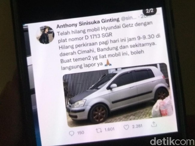 "Telah hilang mobil Hyundai Getz dengan plat nomor D 1713 SGR. Hilang perkiraan pagi hari ini jam 9-9.30 di daerah Cimahi, Bandung dan sekitarnya. Buat temen2 yg liat mobil ini, boleh langsung lapor ya," tulis Ginting.