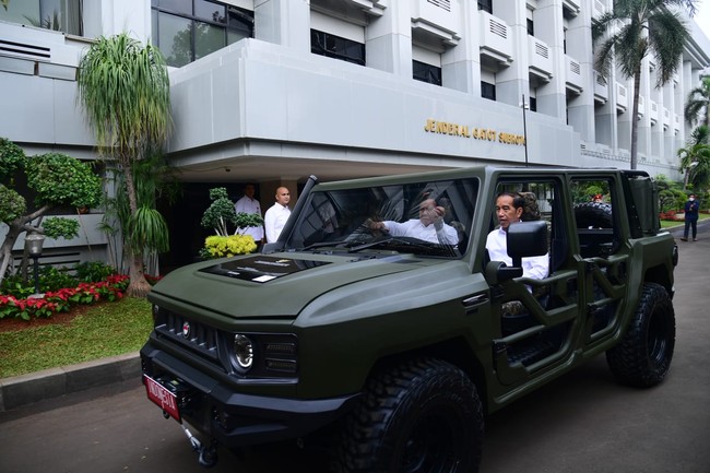 Mengenakan setelan putih dan kemeja hitam, Jokowi tampak duduk di kursi penumpang sebelah kiri. Sementara duduk di kursi sopir ada Menteri Pertahanan Prabowo Subianto. Pindad Maung merupakan kendaraan taktis 4x4 yang dikembangkan Pindad.