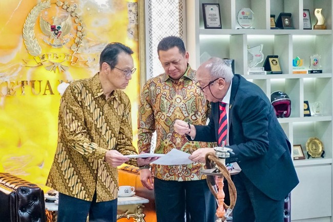 Ketua MPR RI sekaligus Ketua Umum Ikatan Motor Indonesia (IMI) Bambang Soesatyo bertemu dengan Duta Besar Jepang untuk Indonesia H.E. Mr. Kasunagi Kenji di Jakarta, Selasa (7/3/2023). Bamsoet mengajak Jepang untuk menjajaki pengembangan Sister Circuit antara Suzuka International Racing Course, Jepang dengan Sentul International Circuit, Indonesia.