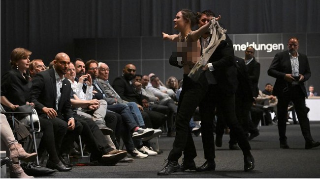 Sejumlah aktivis melancarkan aksi protes saat rapat umum pemegang saham (RUPS) tahunan Volkswagen di Berlin, Jerman, Rabu (10/5/2023). Para aktivis menuding Volkswagen menggunakan sistem kerja paksa di Uyghur, China hingga memprotes lantaran pabrikan Jerman itu masih memproduksi mobil berbahan bakar fossil.