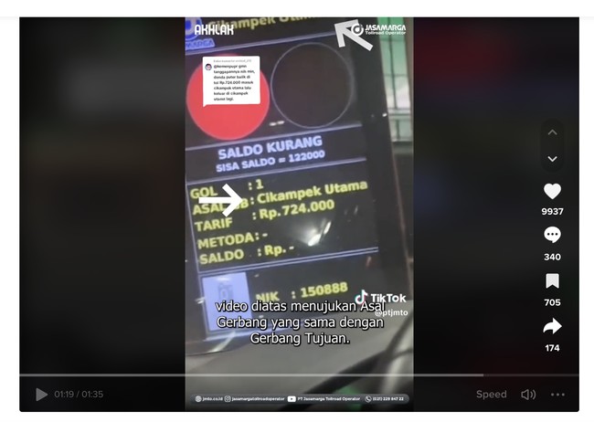"Hari ini gue mau ke Bandung, dan karena kita salah jalur, akhirnya kita keluar tol di kali apa gitu. Dan pas kita masuk lagi ke arah tol Bandung dan keluar Cikampek Utama 4, tarif tolnya berapa? 724 ribu, kan aneh banget" kata seorang pria pada video yang diunggah akun Twitter @Kegoblogan.Unfaedah dikutip Senin (26/6).