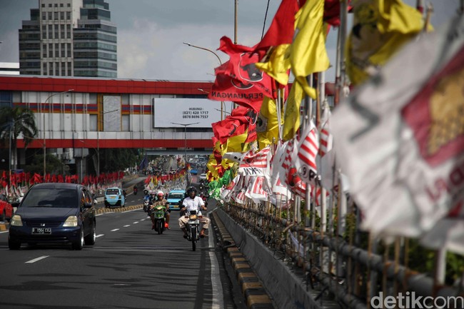 Sejumlah ruas jalan di Tanah Air diwarnai dengan atribut bendera parpol jelang Pemilu 2024. Beberapa bendera itu dipasang di pinggir jalan, namun ada juga yang diikat di tiang pembatas jalan. Pemasangan itu mengganggu lalu lintas. Bahkan saat bendera berkibar justru menutup pandangan pengendara.