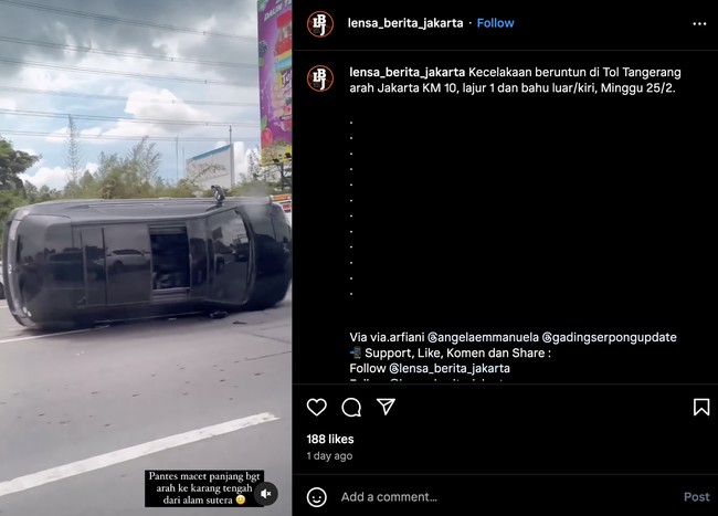 Video detik-detik mobil terguling di jalan tol akibat menyalip dari bahu jalan diunggah akun Instagram @lensa_berita_jakarta. Dilaporkan, peristiwa itu terjadi pada akhir pekan kemarin di Tol Tangerang arah Jakarta.