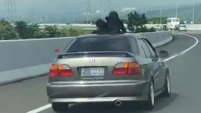Bocah tersebut keluar dari sunroof mobil yang diduga berjenis Honda Accord bernopol F 1644 JJ. Aksi itu terekam oleh pengendara lain yang melintas di jalur sama.