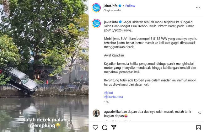 Dalam video yang beredar di media sosial seperti dibagikan akun Instagram jakut.info, mobil derek itu tampak kesulitan menarik Ford Everest. Saking sulitnya, mobil justru tidak terderek sama sekali. Saat mobil derek maju, Ford yang ditarik menggunakan tali itu justru malah menyasar ke kali dan berujung nyemplung. Tiga perempat badan mobil pun sudah tenggelam di kali tersebut.
