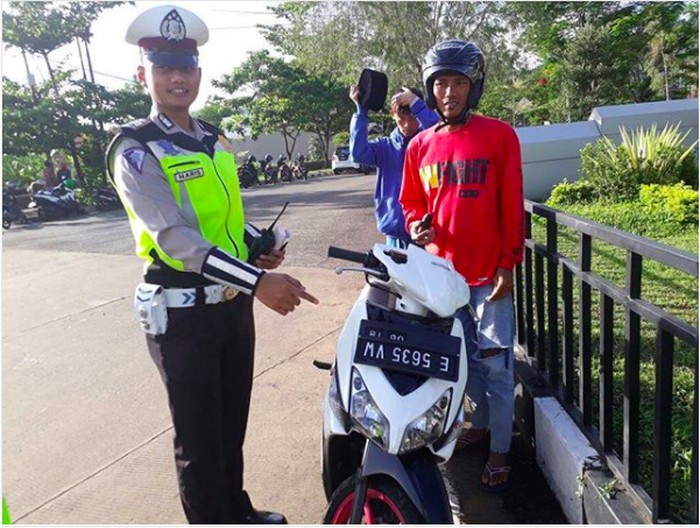 Seperti yang terlihat pada foto yang diunggah akun Instagram @tmcpolrestabesbandung. Mungkin saking idenya kreatif pria berbaju merah itu, dia ingin berbeda dengan yang lain, jadilah plat nomor kendaraannya di balik.