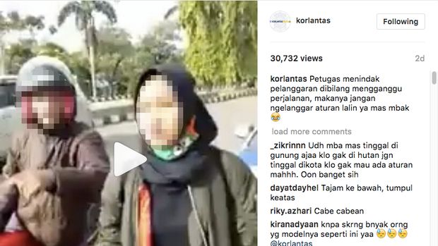 "Petugas menindak pelanggaran dibilang mengganggu perjalanan, makanya jangan ngelanggar aturan lalin (lalu lintas) ya mas mbak," tulis akun Korps Lalu Lintas Polri (Korlantas) di Instagram sambil menyertakan videonya.