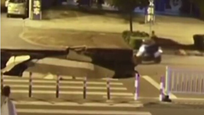 Saking asyiknya bermain ponsel, ia tak memperhatikan jalanan di depannya yang tiba-tiba runtuh membuat lubang yang besar dan masuk ke dalam lubang sedalam 1,8 meter.