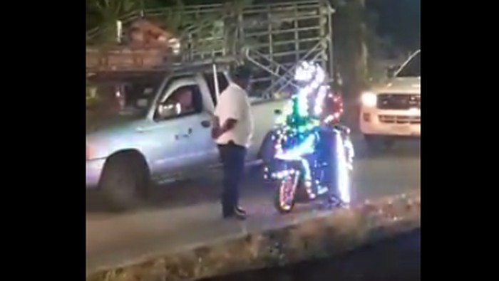 Dalam video yang diunggah akun Facebook Pattawee Thaitongrattana, seluruh bagian motor serta tubuhnya, mulai dari helm sampai ujung kakinya dihiasi lampu kelap-kelip.