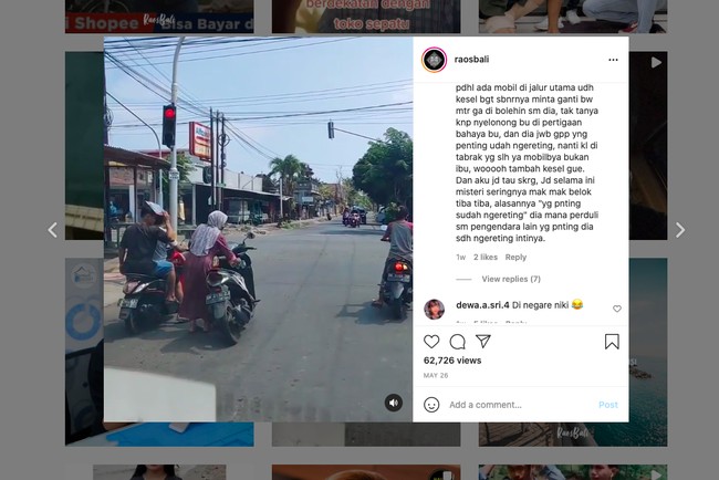 "Mak mak kl bw motor mana ngerti dia rambu rambu, makanya banyak yg ngawur di jalanan, pernah saya di bonceng sama ibu mertua udah tahu pertigaan main nyelonong aja ga liat kanan kiri padahal ada mobil di jalur utama udah kesel banget sebenernya minta ganti bawa motor ga dibolehin sama dia, tak tanya kenapa nyelonong bu di pertigaan bahaya bu, dan dia jawab gak apa-apa yang penting udah ngereting, nanti kalau ditabrak yang salah ya mobilnya bukan ibu, wooooh tambah kesel gue. Dan aku jadi tahu sekarang, Jd selama ini misteri seringnya mak mak belok tiba tiba, alasannya "yang penting sudah ngereting" dia mana perduli sm pengendara lain yang penting dia sudah ngereting intinya," tulis Prev_Love pada akun Raosbali.
