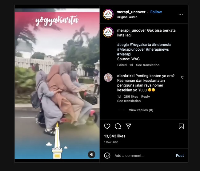 Aksi nekat dan berbahaya keempat perempuan tersebut diunggah di akun Instagram @merapi_uncover pada Rabu (28/12/2022). Pengunggah tidak menjelaskan di mana peristiwa itu terjadi, namun sepertinya terjadi di daerah Malioboro, Provinsi Daerah Istimewa Yogyakarta (DIY).