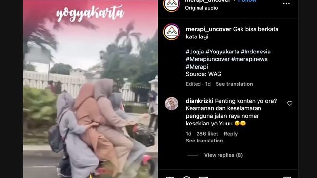 Aksi nekat nan berbahaya keempat perempuan tersebut diunggah oleh akun Instagram @merapi_uncover (28/12). Pengunggah tidak menjelaskan di mana peristiwa itu terjadi, namun diduga terjadi di daerah Malioboro, Provinsi Daerah Istimewa Yogyakarta (DIY).