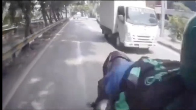 Bermain HP saat mengendarai motor, driver ojol ini menabrak mobil didepannya dan kepalanya hampir terlind4s truk.