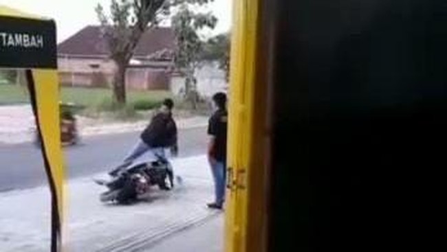 Dalam video yang beredar di media sosial. Anak itu memakai celana abu-abu seragam sekolah dan jaket hitam. Dia mengamuk dengan menendang-nendang motor.