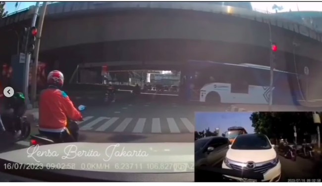 Bahkan mereka sempat memotong laju bus TransJakarta yang tengah melintas. Bus TransJakarta itu sempat terhenti sejenak, lalu melanjutkan perjalanannya ketika pemoge itu berhenti. Setelah bus TransJakarta melintas, rombongan moge itu kembali menerobos lampu merah.