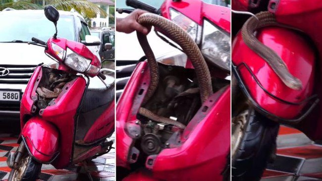Peristiwa itu terjadi di Kerala, India. Dalam sebuah video singkat, akun Instagram @jobinkmani_jantm memperlihatkan seekor ular king cobra bersarang di balik tebeng motor matic Honda Activa. Ular tersebut tampak melingkar di balik tebeng motor.