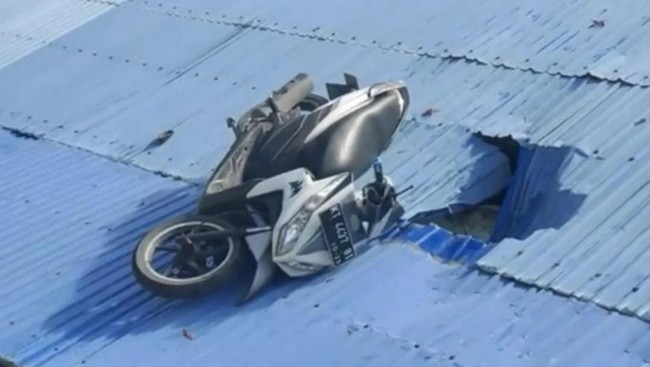 Tayangan singkat yang dibagikan akun Instagram @memomedsos itu menunjukkan kondisi motor Honda Vario yang telah tergeletak di atap rumah warga. Sementara itu, ada beberapa bagian atap yang terlihat rusak dan jebol.