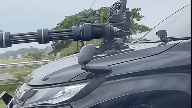 Viral di media sosial mobil SUV Mitsubishi Pajero Sport dilengkapi aksesori seperti senapan mesin. Aksesori senapan itu dipasang di bagian depan, tepat di atas kap mesin mobilnya.