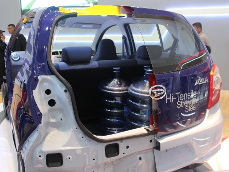 Jadi ketika terjadi tabrakan dari depan, kerangka Ayla bisa mengalirkan energi benturan dari depan ke belakang, melampaui kabin penumpang sehingga penumpang terlindungi dari energi benturan.