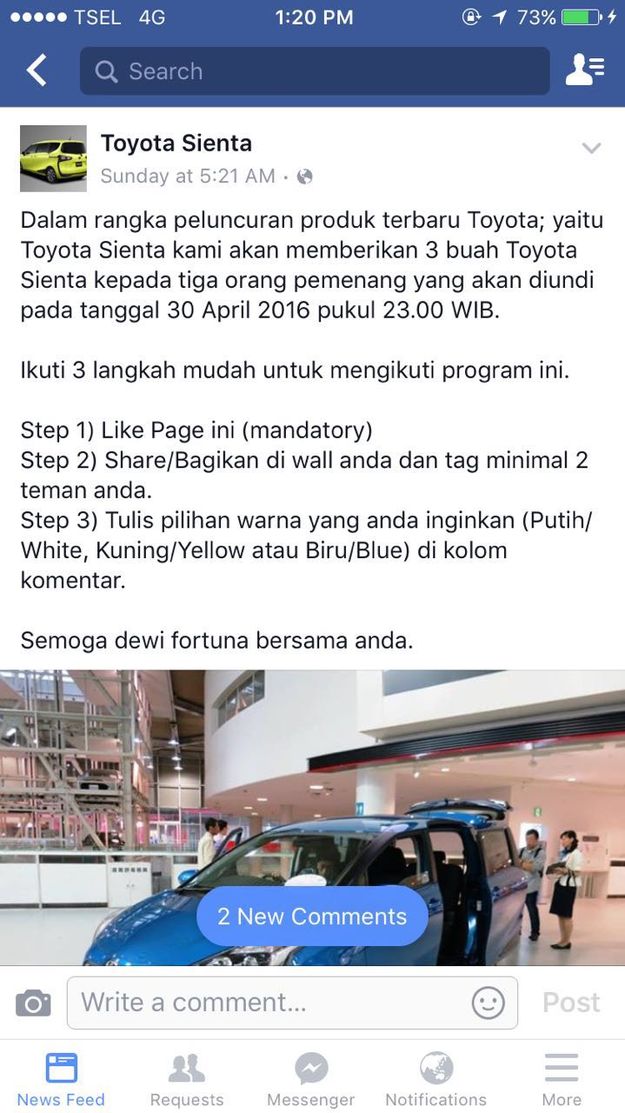 Dalam salah satu akun Facebook palsu yang mengatasnamakan Toyota Sienta menyebut, dalam rangka peluncuran Toyota Sienta, akun itu akan memberikan tiga Sienta kepada tiga orang pemenang yang diundi pada 30 April 2016 pukul 23.00 WIB. Informasi itu jelas-jelas adalah tipuan karena dari tiga pilihan warna yang ditawarkan, dua warna di antaranya tidak dijual di Indonesia.