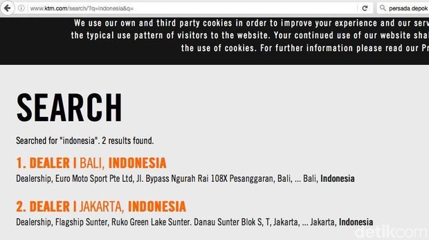 Dalie menegaskan, jika ingin mencari kejelasan siapa sebenarnya distributor resmi KTM di Indonesia, coba untuk melihat di website resmi ktm.com. Di website tersebut bisa dilacak distributor di Indonesia melalui kolom pencarian dealer.