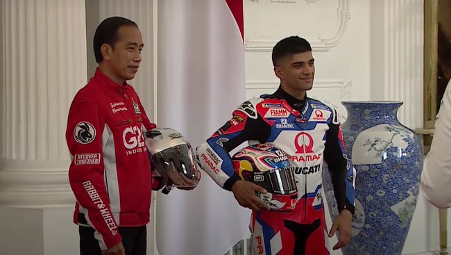Presiden Jokowi menerima sejumlah pebalap MotoGP, Moto2, Moto3, dan ATC di Istana Merdeka, Jakarta, Rabu (16/3/2022). Jokowi juga melakukan sesi foto dengan para rider. Menariknya, Jokowi menenteng produk helm lokal yang harganya kisaran Rp 600 ribuan. Foto: Screenshot Youtube Sekretariat Presiden