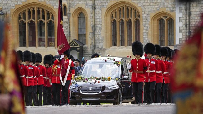 Mobil jenazah dengan peti mati Ratu Elizabeth II bergerak menuju Kapel St. George di Kastil Windsor, di Windsor, Inggris, Senin, (19/9/2022). Ratu yang meninggal dalam usia 96 pada 8 September, dimakamkan di Windsor bersama mendiang suaminya, Pangeran Philip yang meninggal tahun lalu. AP/Jon Super