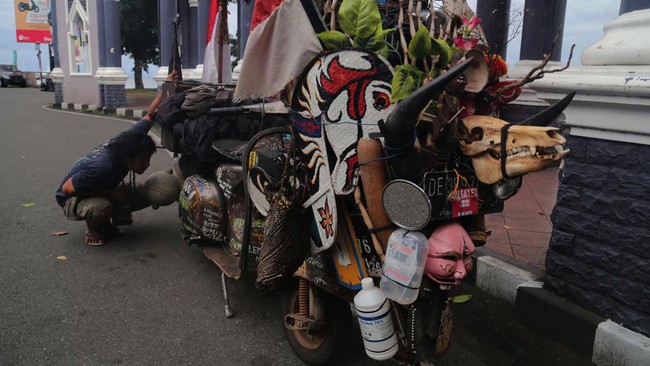 Pesepeda motor vespa asal Indramayu Ismail mengecek kondisi motor saat singgah di Kota Ternate, Maluku Utara, Kamis (13/7/2023).