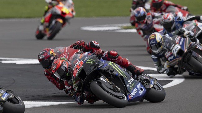 Dalam balapan di Sirkuit Silverstone, Inggris, Quartararo sedang menjajal fairing baru. Dia start dari posisi 22, tapi berhasil merengsek masuk posisi tujuh. Foto: Yamaha Monster Energy