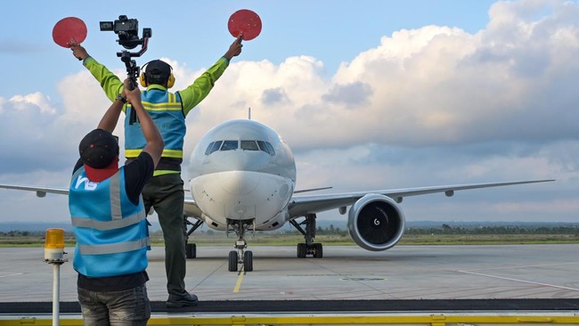 Lombok - Pesawat kargo yang membawa logistik MotoGP mendarat di Bandara Internasional Lombok (BIL), Praya, Lombok Tengah, NTB. Begini penampakannya.