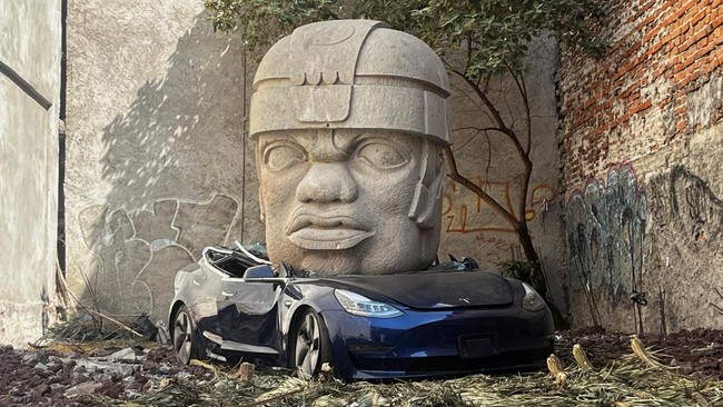 Dilaporkan NBC, patung kepala yang menyerupai patung Pribumi kuno terletak di atas mobil Tesla yang hancur. Ini bukan adegan kecelakaan, tapi sebuah karya seni. Pembuatnya mengatakan ingin memprovokasi Elon Musk, bos Tesla.