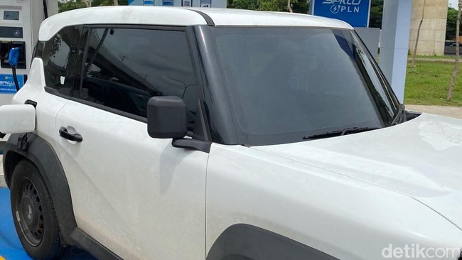 Mobil itu sedang dicas di SPKLU yang ada di rest area tersebut. Dilihat secara langsung, mobil ini tampak mungil dengan dua pintu, tapi desainnya kotak ala SUV offroad. Mobil SUV mungil tersebut punya dimensi panjang 3.190 mm, lebar 1.679 mm, dan tinggi 1.622 mm, serta ground clearance 191 mm yang tinggi.
