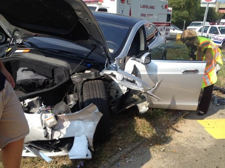 Tesla Model S milik Jodovi ini dihantam keras oleh Hyundai Elantra yang melaju dengan kecepatan tinggi. Dikabarkan kalau pengendara Hyundai Elantra menerobos lampu merah sambil menggunakan telepon.