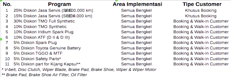 Toyota misalnya, pabrikan Jepang ini menyediakan Paket Servis Berkala Jelang Mudik Lebaran berupa diskon jasa servis dan diskon parts hingga 30% kepada pelanggan.