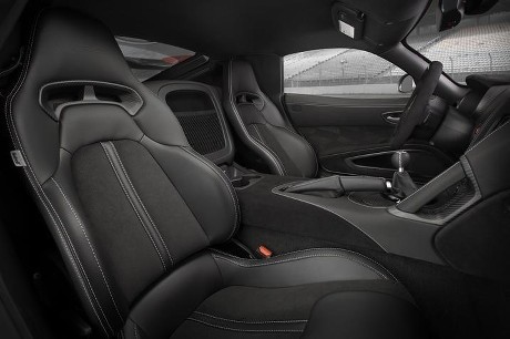 Setirnya juga dibalut dengan alcantara dengan warna strip khas balap. Alcantara juga membungkus jok, sementara di dashboardnya ada serat karbon. Konsumen bisa memilih jahitan berwarna perak atau merah di seluruh interiornya.