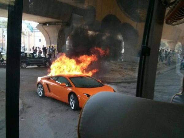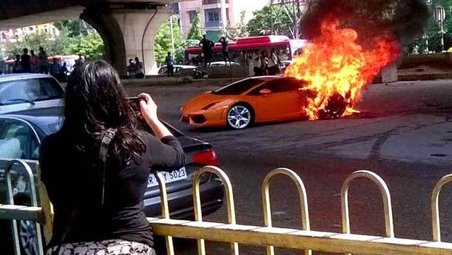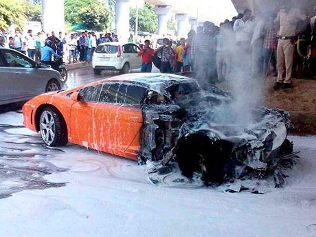 Mobil Lamborghini Gallardo yang dikendarai Surjan Singh terbakar beberapa hari lalu di tengah jalan dekat Stasiun Bardarpur Metro, New Delhi.