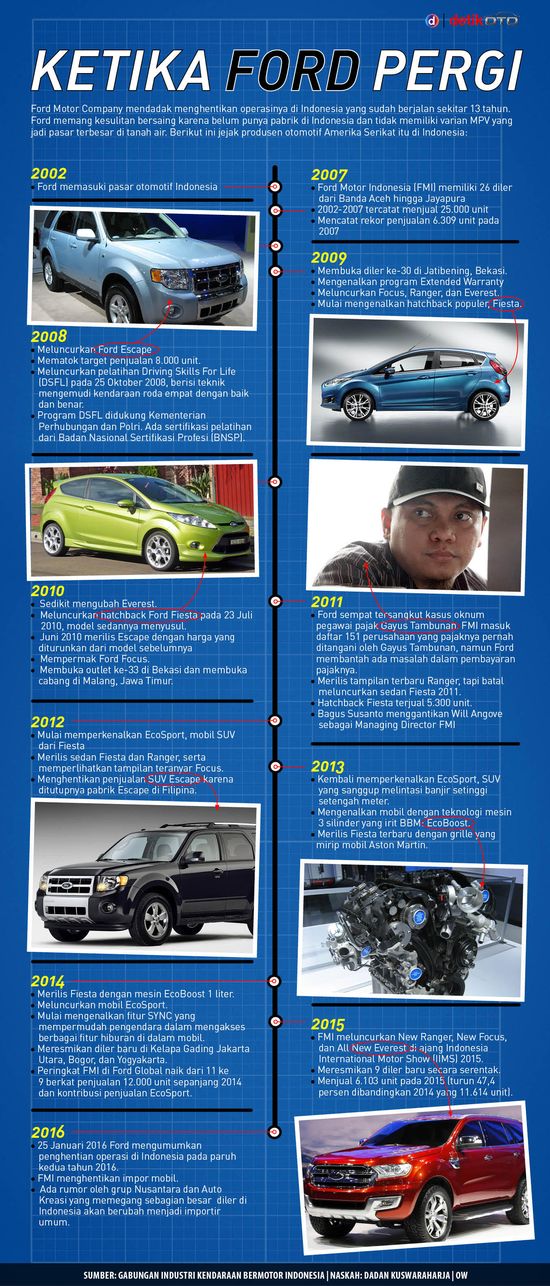 Direktur Jenderal Industri Logam, Mesin, Alat Transportasi, dan Elektronika (ILMATE) Kementerian Perindustrian, I Gusti Putu Suryawirawan mengatakan sejak awal kemunculan di Indonesia pada tahun 2002, Ford hanya memasarkan mobil di Indonesia tanpa membangun manufaktur.