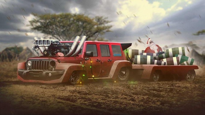 Hasilnya Jeep Wrangler milik Santa diubah menjadi dengan menonjolkan ketangguhan mesinnya yang ditaruh di luar kap mesin.