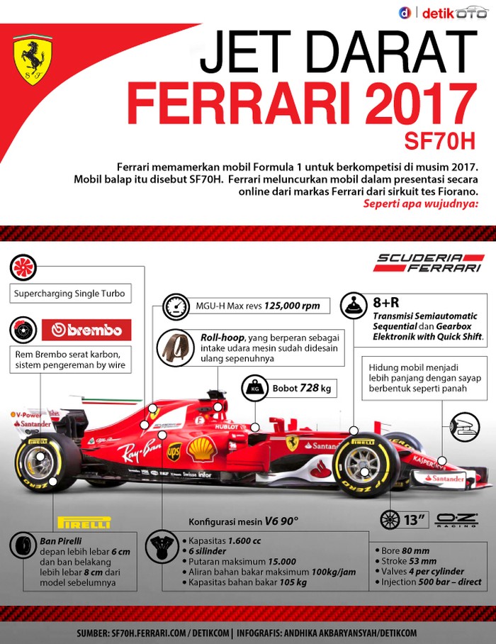 Jakarta - Ferrari memamerkan mobil Formula 1 untuk berkompetisi di musim 2017. Mobil balap itu disebut SF70H. Ferrari meluncurkan mobil dalam presentasi secara online dari markas Ferrari dari sirkuit tes Fiorano. Seperti apa wujudnya