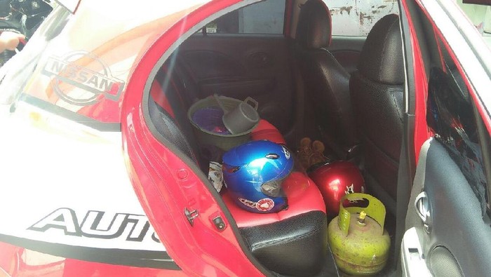 Mobil pelaku setelah diperiksa ternyata ditemukan dua helm lain dan tabung gas LPG 3 kg. Tak hanya itu petugas juga menemukan satu botol minuman keras di dalam mobil.
