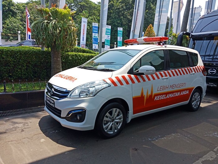 Mobil yang terparkir di luar gedung pameran itu berada di antara deretan bus. Dari eksteriornya, Ertiga Ambulance ini berkelir putih dengan aksen garis-garis merah, serta desain garis seperti detak jantung, dan tulisan 'lebih mengerti keselamatan anda'pada bagian sisi kanan dan kiri mobil.