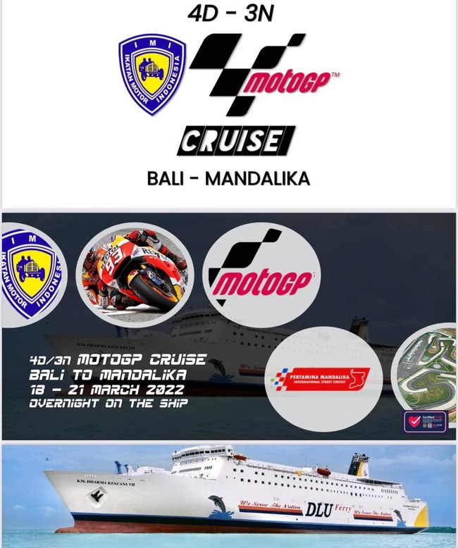 "Pengguna kapal pesiar Ro-Ro Premium, KMP Dharma Kencana VIII juga bisa mendapatkan paket IMI MotoGP Cruise, 4 hari 3 malam. Meliputi akomodasi, transportasi laut, transportasi darat, plus tiket nonton MotoGP. Kapal akan berangkat pada 18 Maret 2022 dari pelabuhan Pelindo Benoa, Bali menuju pelabuhan Pelindo Gili Mas, Lombok. Kapal kemudian bersandar di Pelabuhan Pelindo Gili Mas pada 18-20 Maret 2022, penonton menginap di dalam kapal. Kembali ke Bali pada 21 Maret 2022," ujar Ketua MPR RI itu di Jakarta, Rabu (9/2/2022).
