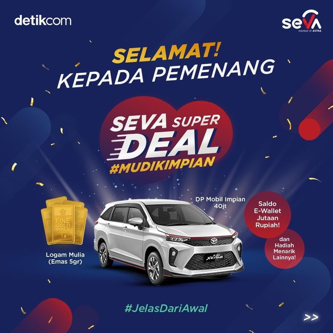 Caranya pun sangat mudah, yaitu dengan mendaftarkan diri di website SEVA. Selain hadiah DP mobil, peserta undian juga bisa memenangkan beragam hadiah menarik lainnya seperti 2 Logam Mulia (masing-masing 5 gram) untuk 2 orang pemenang dan saldo e-wallet total Rp 6 juta untuk 12 orang pemenang.
