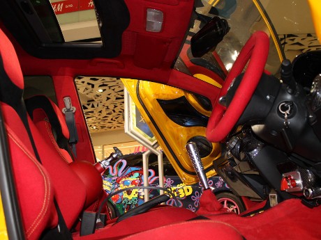 Karbon juga menjadi bahan dasar interior, terutama pada bagian dashboard yang dilengkapi dengan komputer untuk mengatur audio mobil. Setir juga diganti dengan menggunakan setir modif.