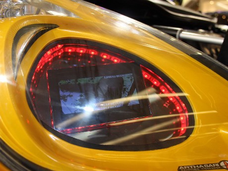 Selanjutnya perubahan juga headlamp yang terlihat unik karena di dalamnya dilengkapi dengan monitor tv berukuran 3,5 inci.