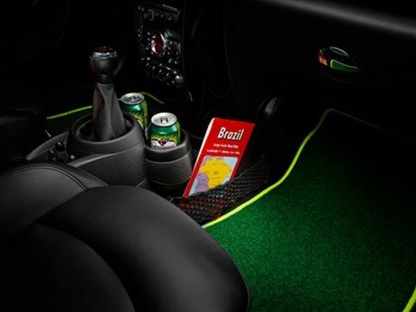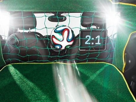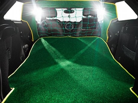 Interior mobil ini jauh dari kesan off-side. Lihat saja karpetnya yang berwarna hijau Brasileiro Green yang dilengkapi dengan lampu LED. Pencahayaan Lampu LED di dalam interior ini dibuat untuk menyerupai stadium. Jadi jangan salah jika penumpangnya bisa melakukan 'Mexican Waves' di dalam mobi.