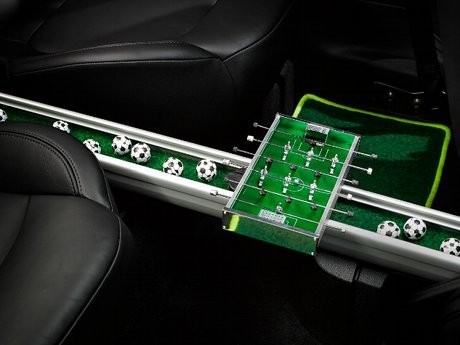 Jika Anda sudah tegang menunggu pertandingan dimulai tidak ada salahnya jika mencoba bermain sepakbola meja atau fussballl yang disimpan di center rail mobil. Ukurannya cukup imut dibanding fussball biasa.